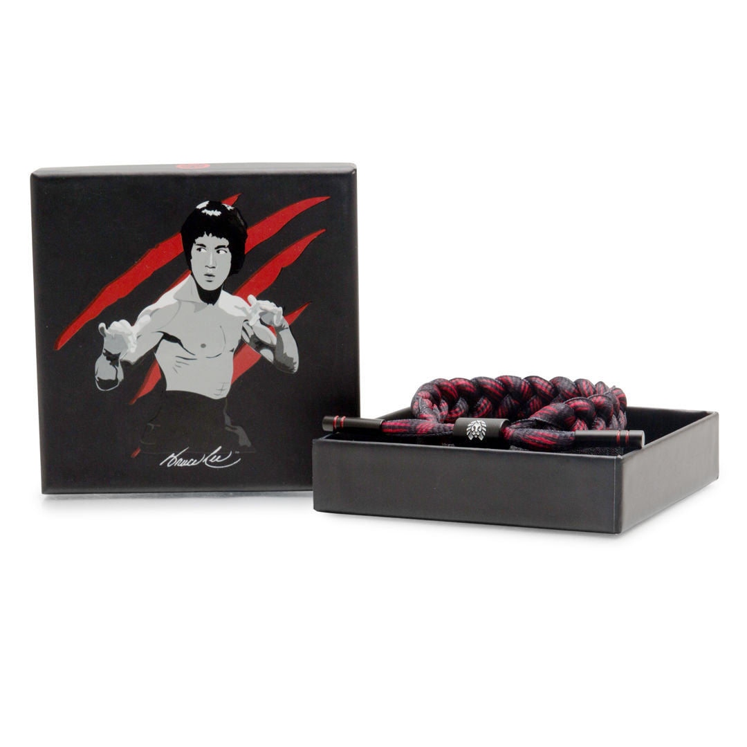 Rastaclat teams up with Bait for a limited edition Bruce Lee collaboration. Dragon claw heat transfer print on a classic braided shoelace bracelet. Black enamel adjustable cylinder with debossed Bruce Lee silhouette and nunchuck aglets. Collector bracelet box with photo card insert.