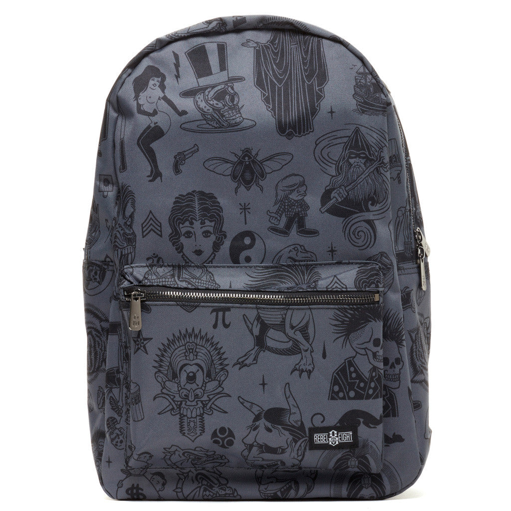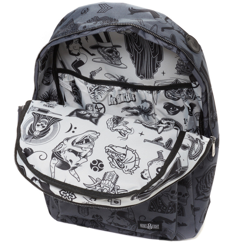 Tattoo flash backpack featuring the artwork of Mike Giant. Front zip pocket with key clip. Larger zipper compartment features laptop slip and headphone port.