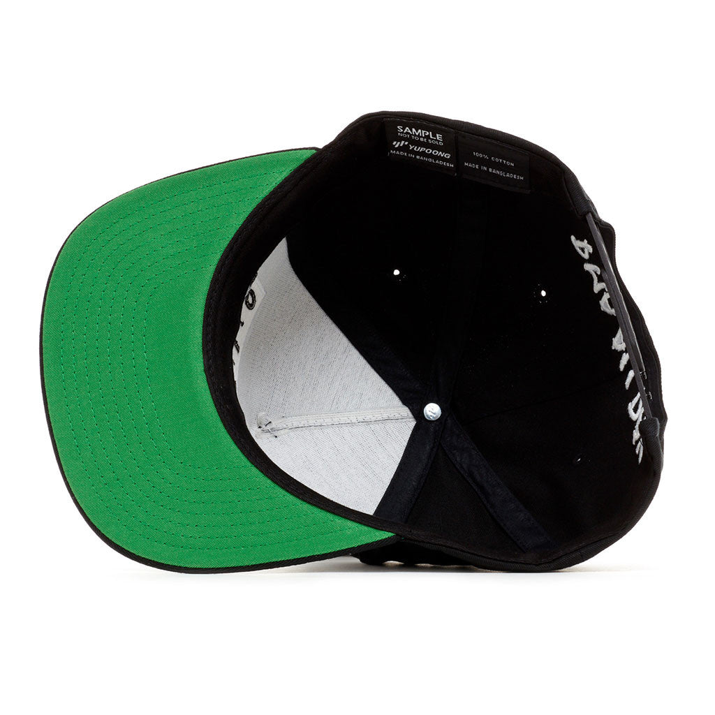 Twill snapback with embroidered design. Green under brim. Back embroidery says, "PMA All Day"