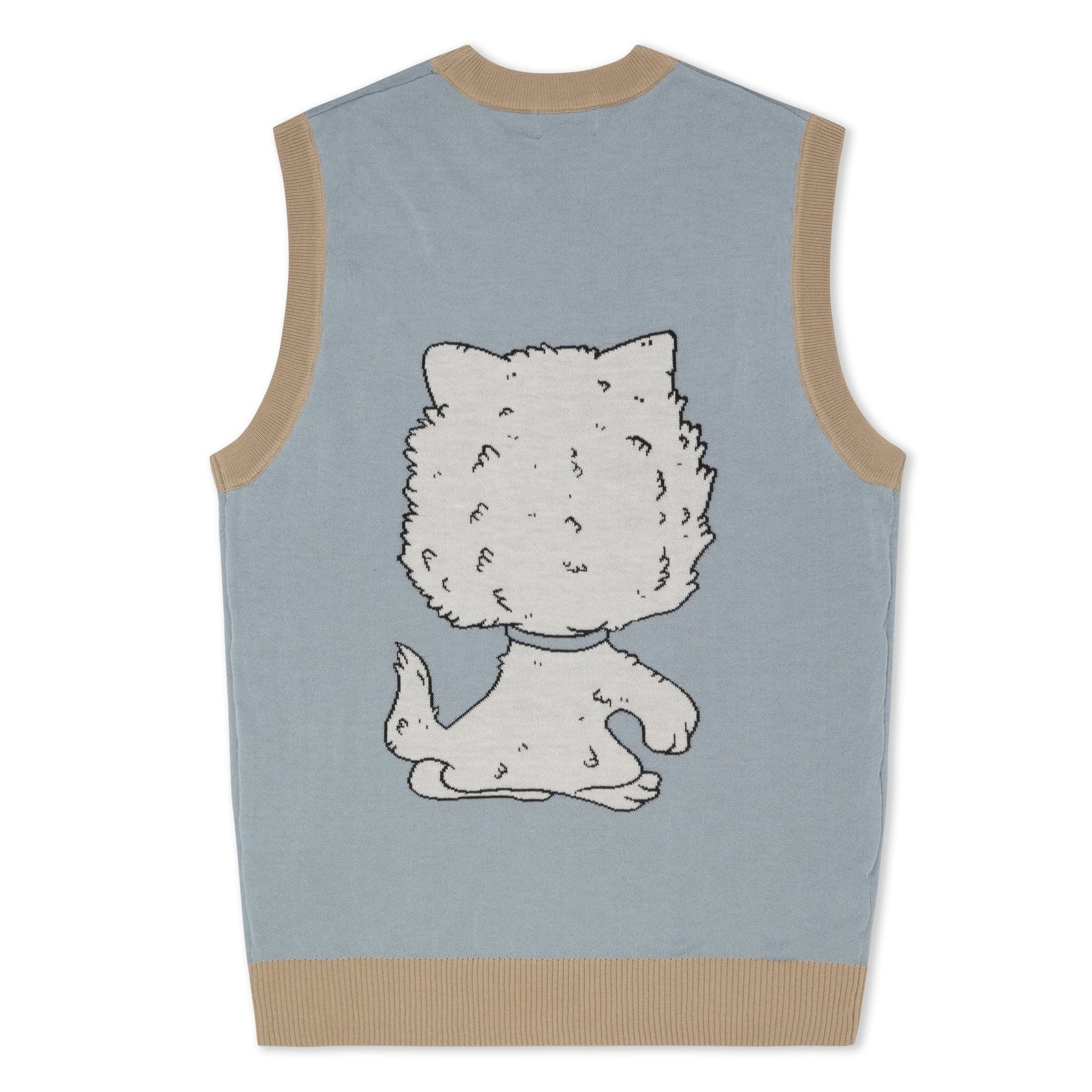 Big Head Nermal on front & back of a light slate blue sweater vest. Contrast ribbing around neckline, armholes and hemline.