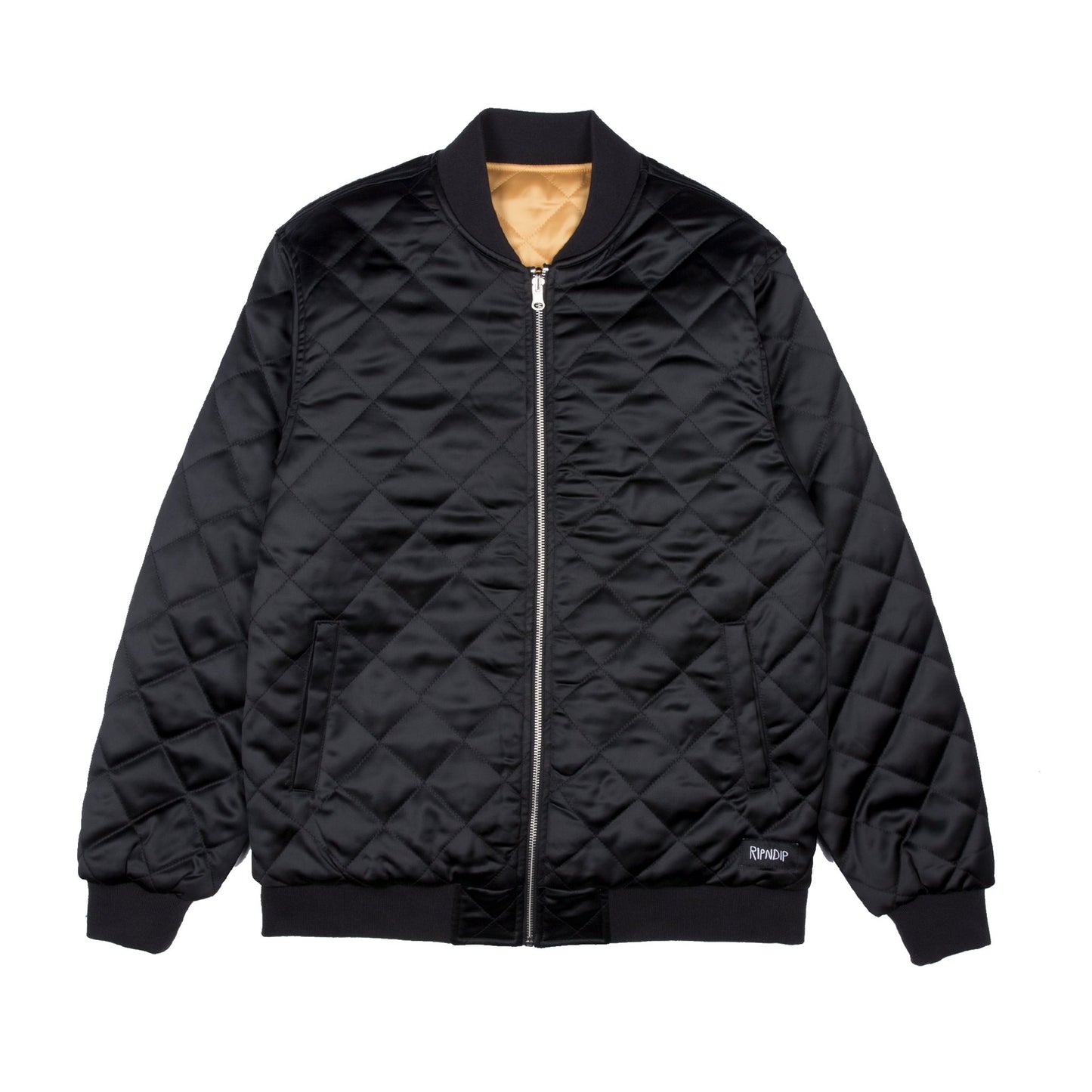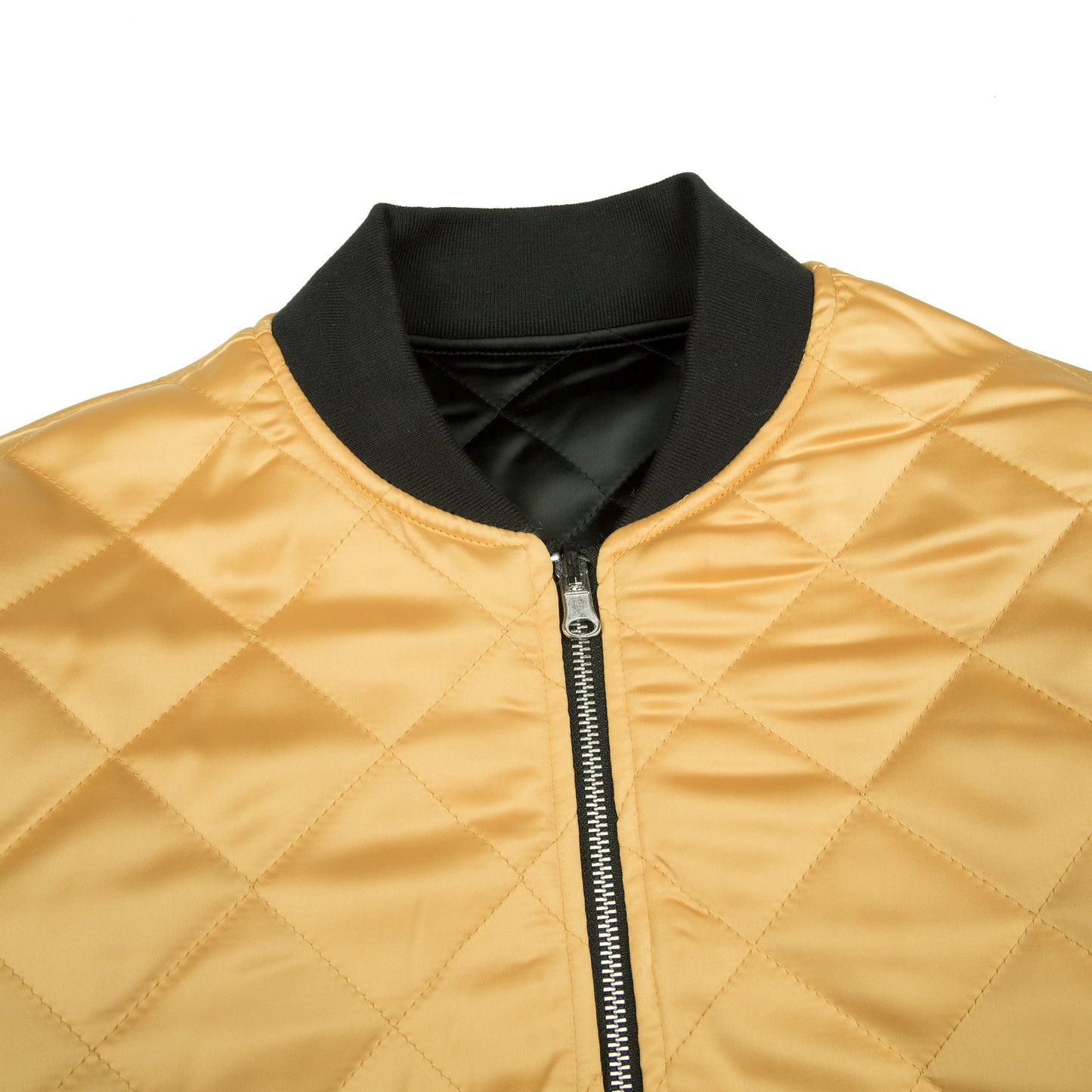 Classic quilted reversible black and yellow bomber jacket. Custom direct embroidery of praying hands holding Lord Nermal. Features dual zippers, elastic trims, welt pockets, and logo labeling.