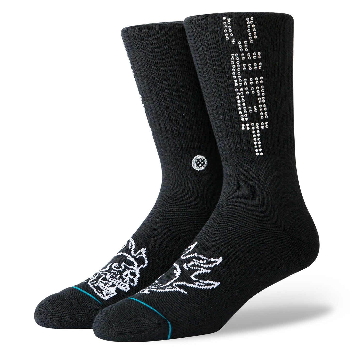 A special collab between Stance & Lil Uzi Vert. A black sock with "Uzi Vert" in rhinestones. Skull over both toes.