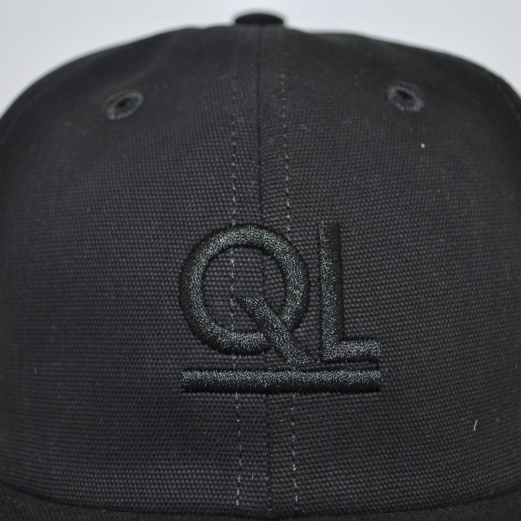 Cargo canvas fabric with direct QL logo embroidery. Woven clip label near black faux leather adjustable strap.