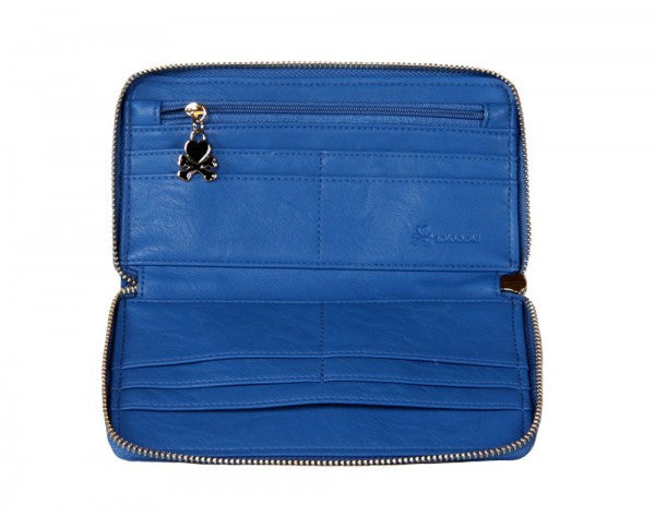 Large zip wallet with vegan leather interior & trim and space for 8 cards. Interior zip compartment for coins. tokidoki logos on zipper pulls.