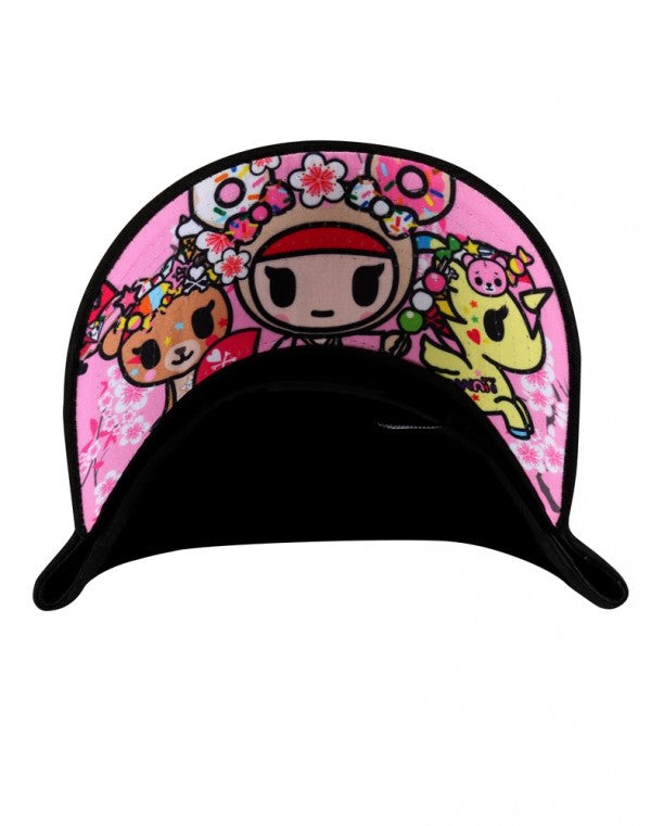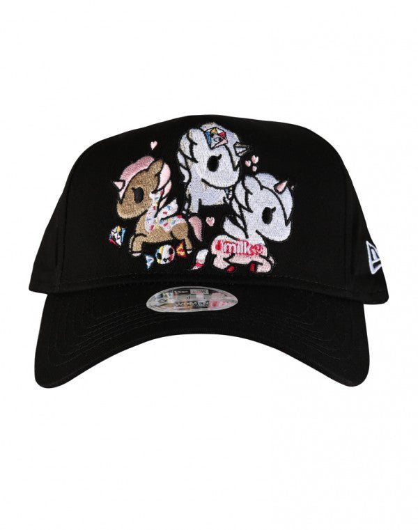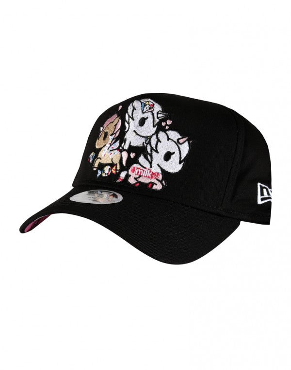 tokidoki x New Era 9FORTY adjustable black cotton snapback. Triple the cuteness with this trio of unicornos featuring: Dolce, Diamante, and Rosa Latte. Sublimated Donutella print on the underside of bill. tokidoki skull and crossbones is embroidered on the back in white.