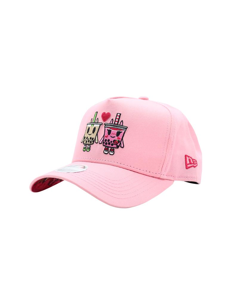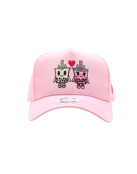 Boba Bob and Boba Betty equals big boba love. New Era 9FORTY adjustable snapback. Sublimated Boba Love, Donutella and her Sweet Friends print on the underside of bill. tokidoki skull and crossbones graphic embroidered on the back of hat in hot pink.