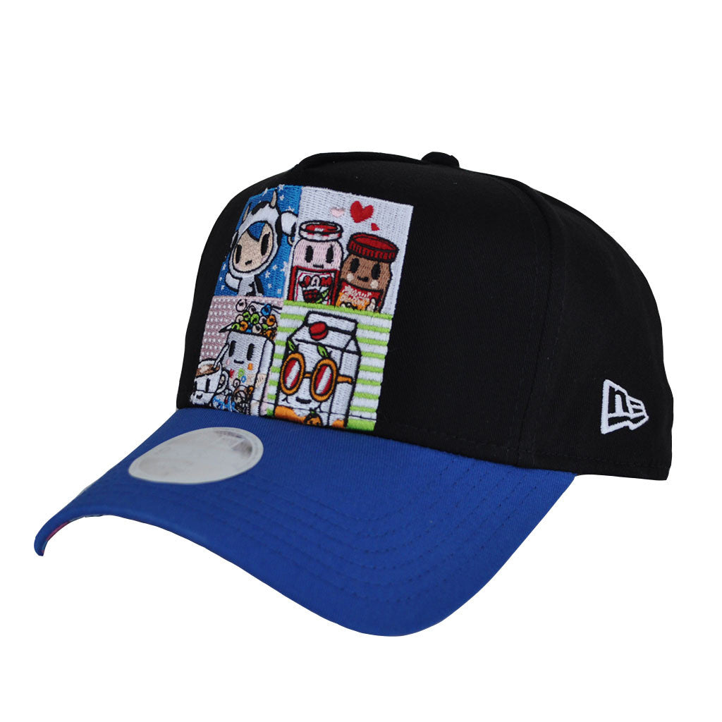 tokidoki x New Era 9FORTY adjustable snapback. Start your day with a perfectly balanced breakfast! Features four embroidered breakfast must haves. Sublimated breakfast print on the underside of bill. tokidoki skull and crossbones is embroidered on the back in white.