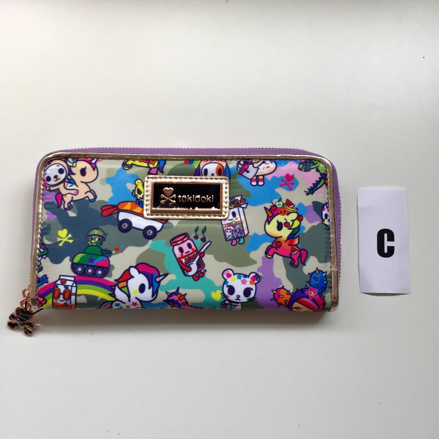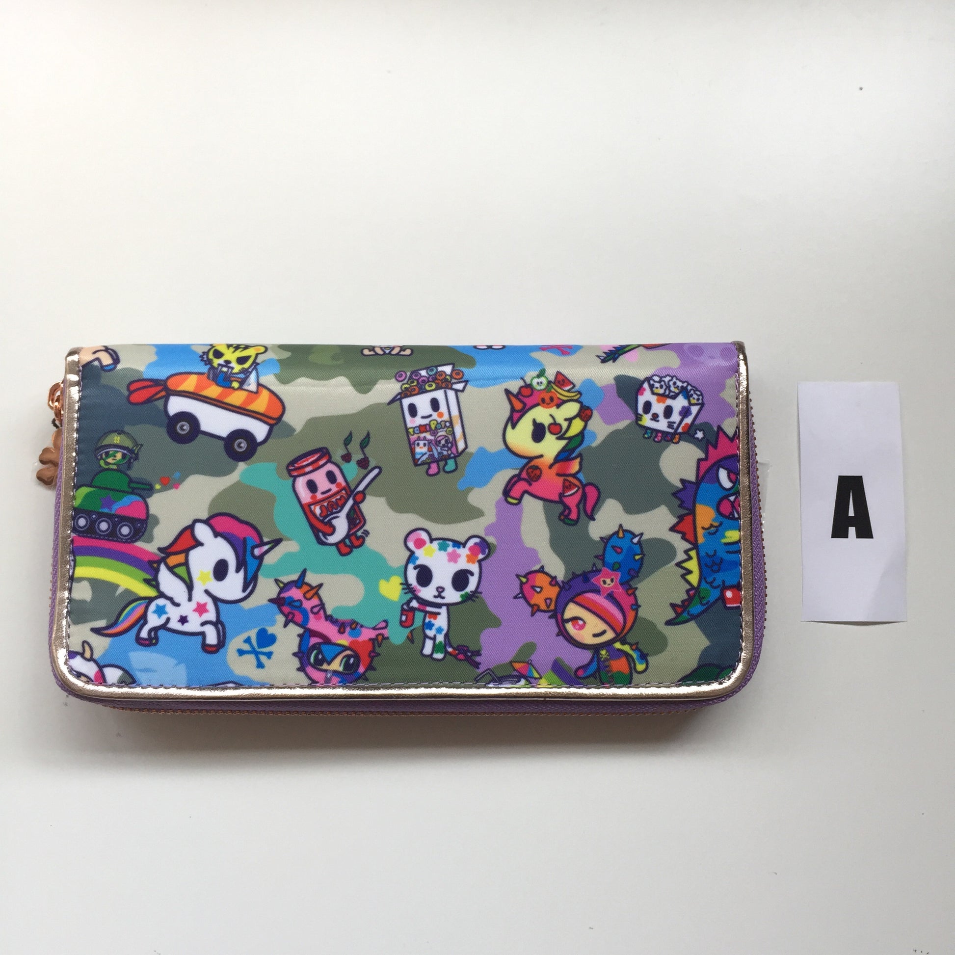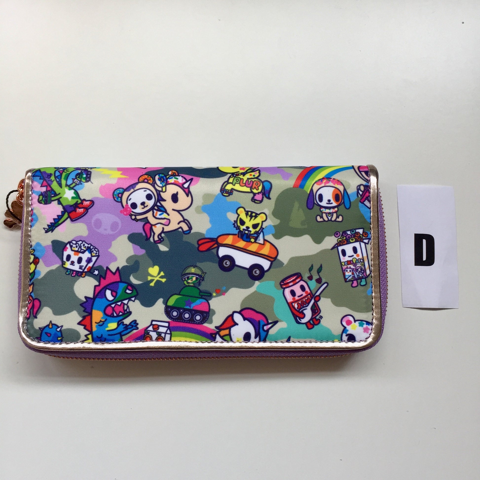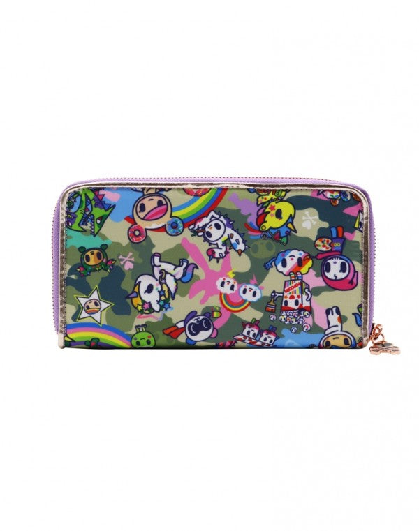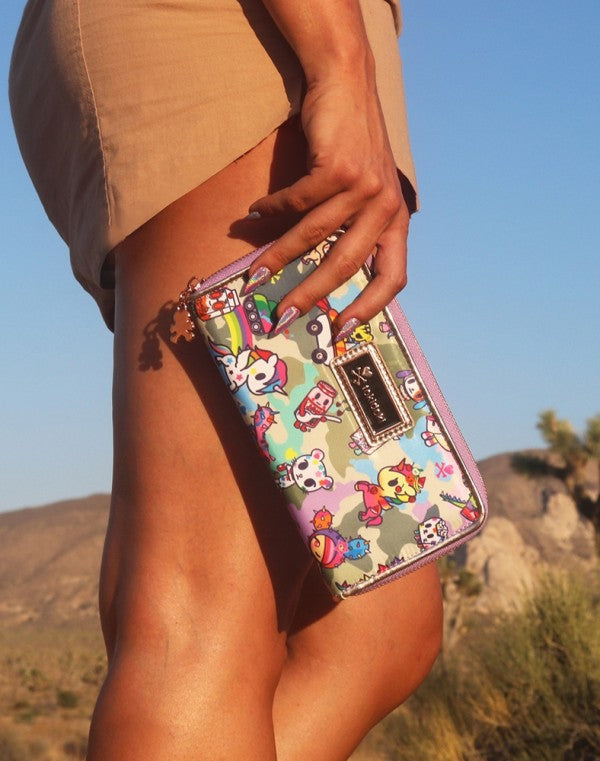 Stay undercover cute with the new Camo Kawaii Collection! Features an all star cast of tokidoki characters on a sublimated camo pattern. This large zip wallet is perfect for staying organized and on the go! Vegan leather interior & trim and space for eight cards. Interior zip compartment for coins. tokidoki logos on zipper pulls.