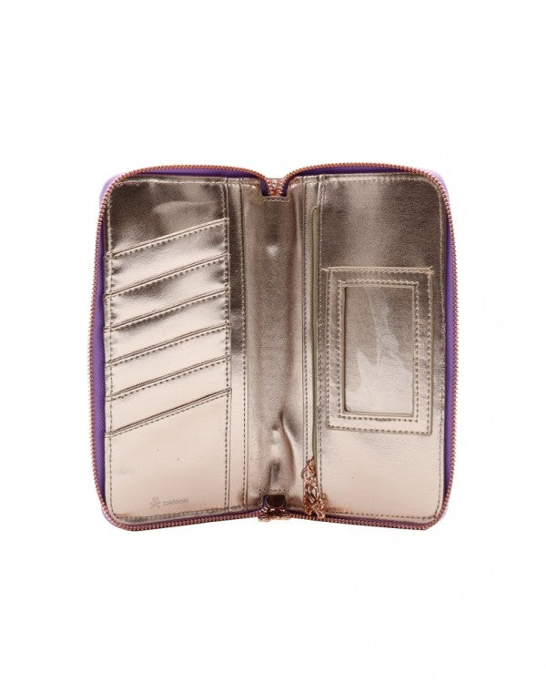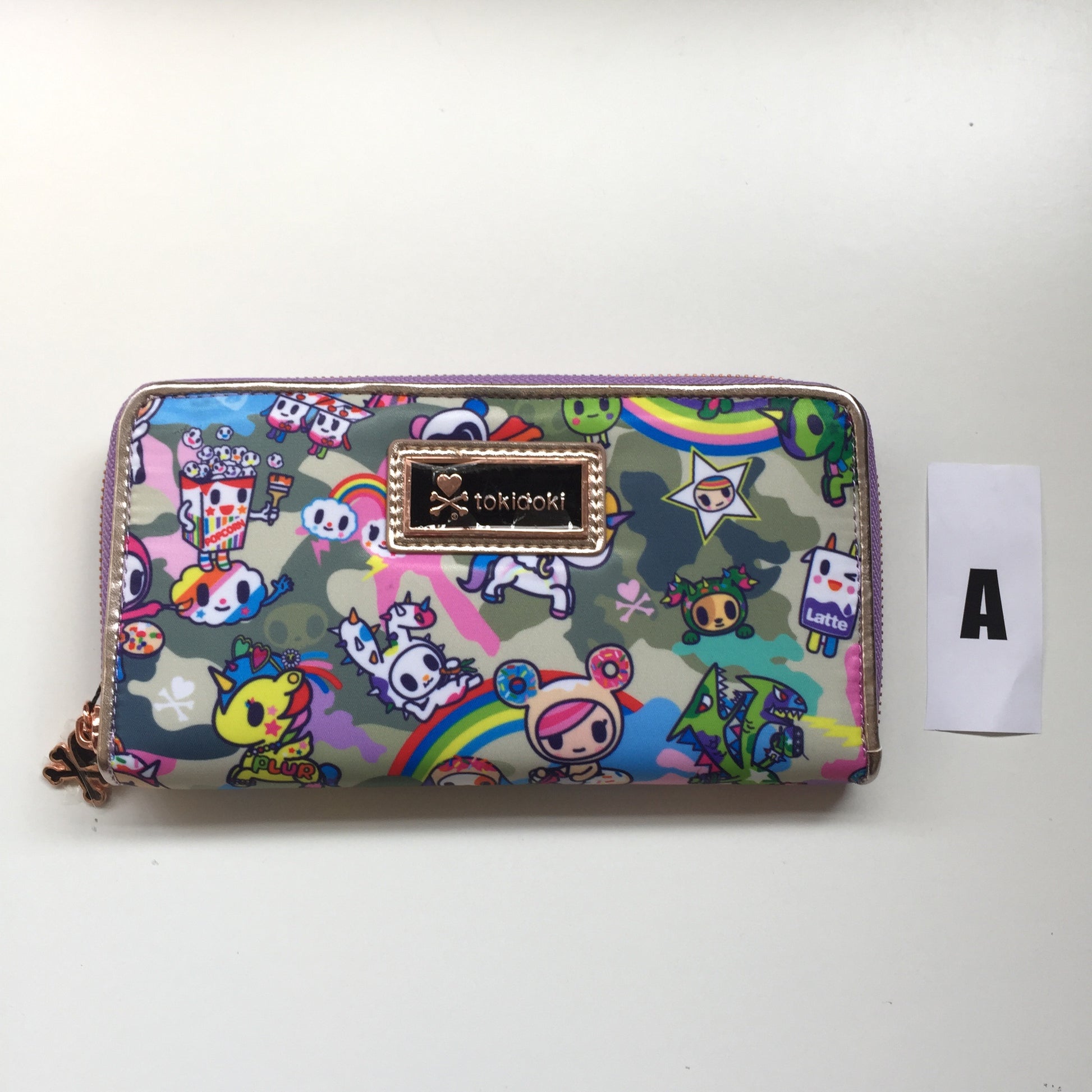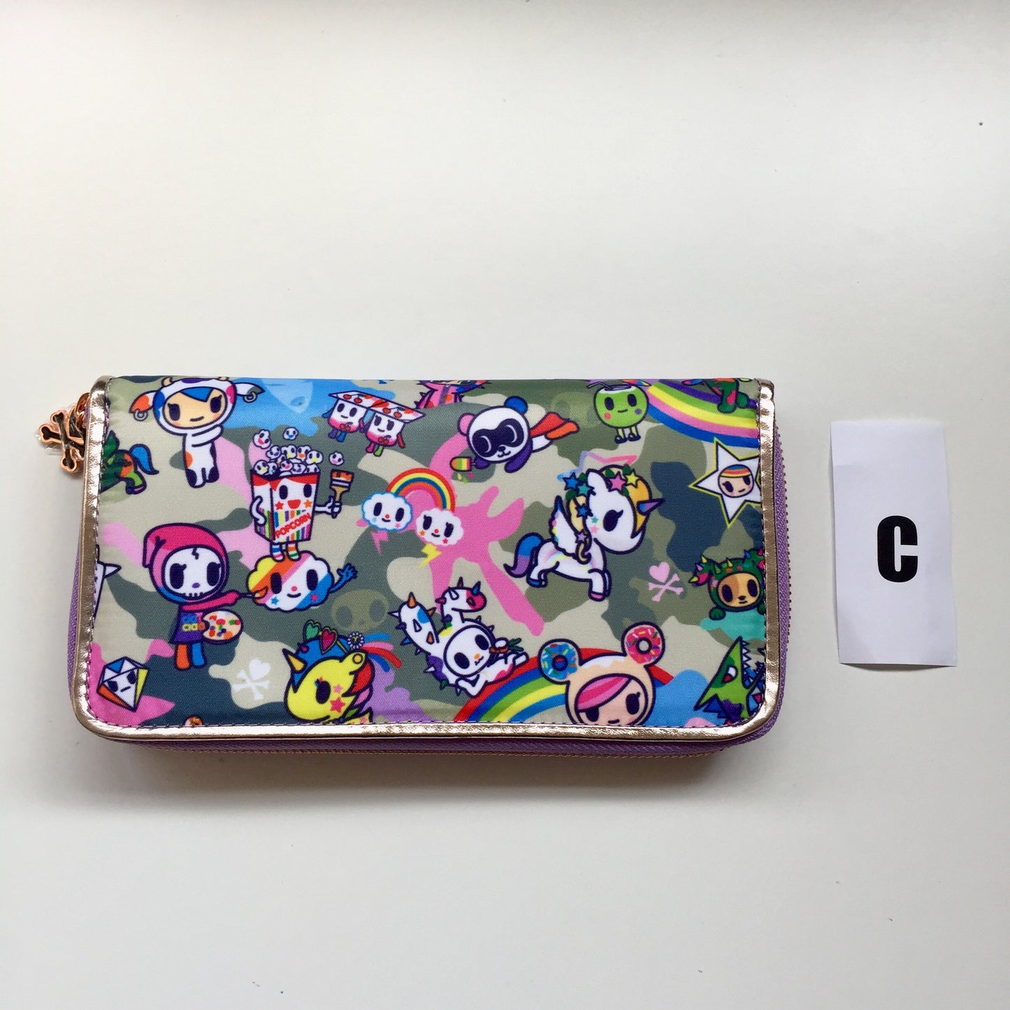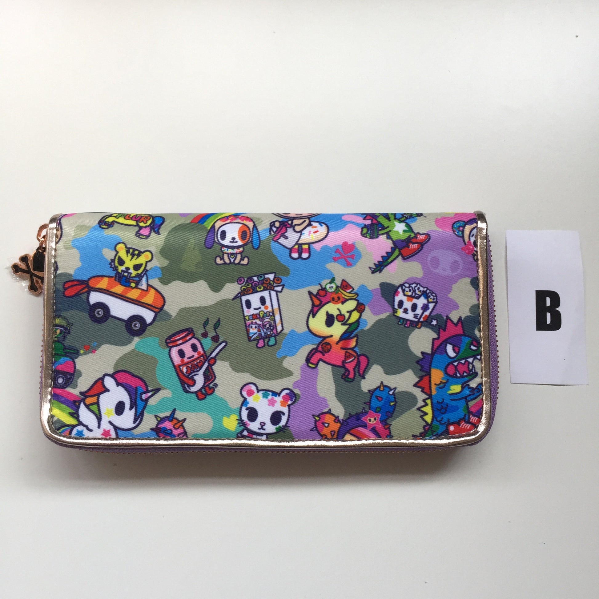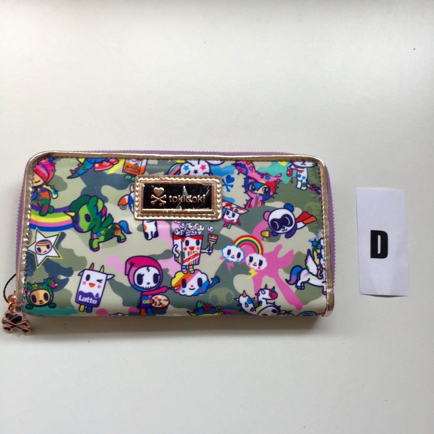 Stay undercover cute with the new Camo Kawaii Collection! Features an all star cast of tokidoki characters on a sublimated camo pattern. This large zip wallet is perfect for staying organized and on the go! Vegan leather interior & trim and space for eight cards. Interior zip compartment for coins. tokidoki logos on zipper pulls.