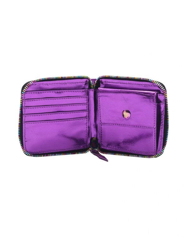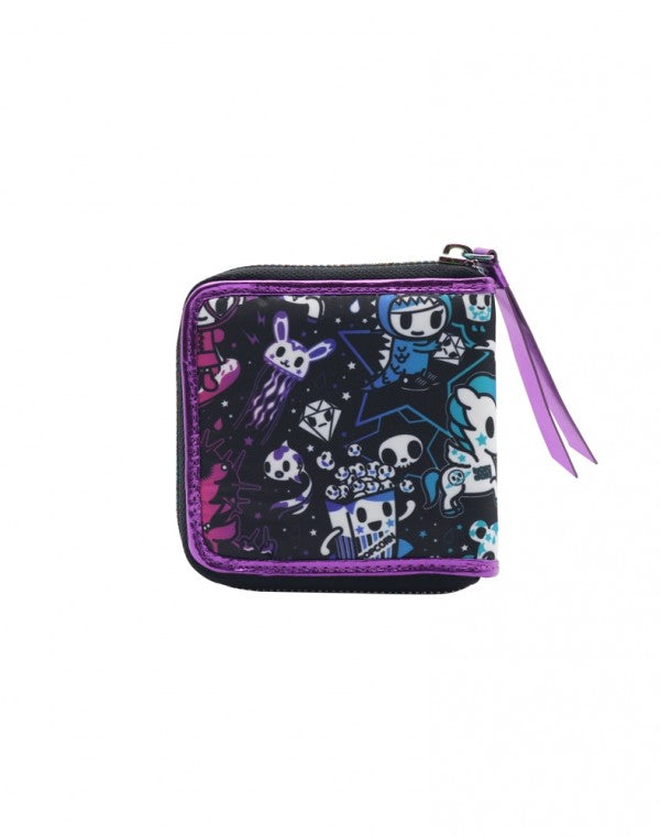 Welcome to the magical universe of the Galactic Dreams Collection! Features an star cast of tokidoki characters on a black galaxy background. This small zip wallet is perfect for staying organized and on the go! Purple metallic interior and trim, space for four cards, and rainbow metallic zipper. Interior snap compartment for coins.