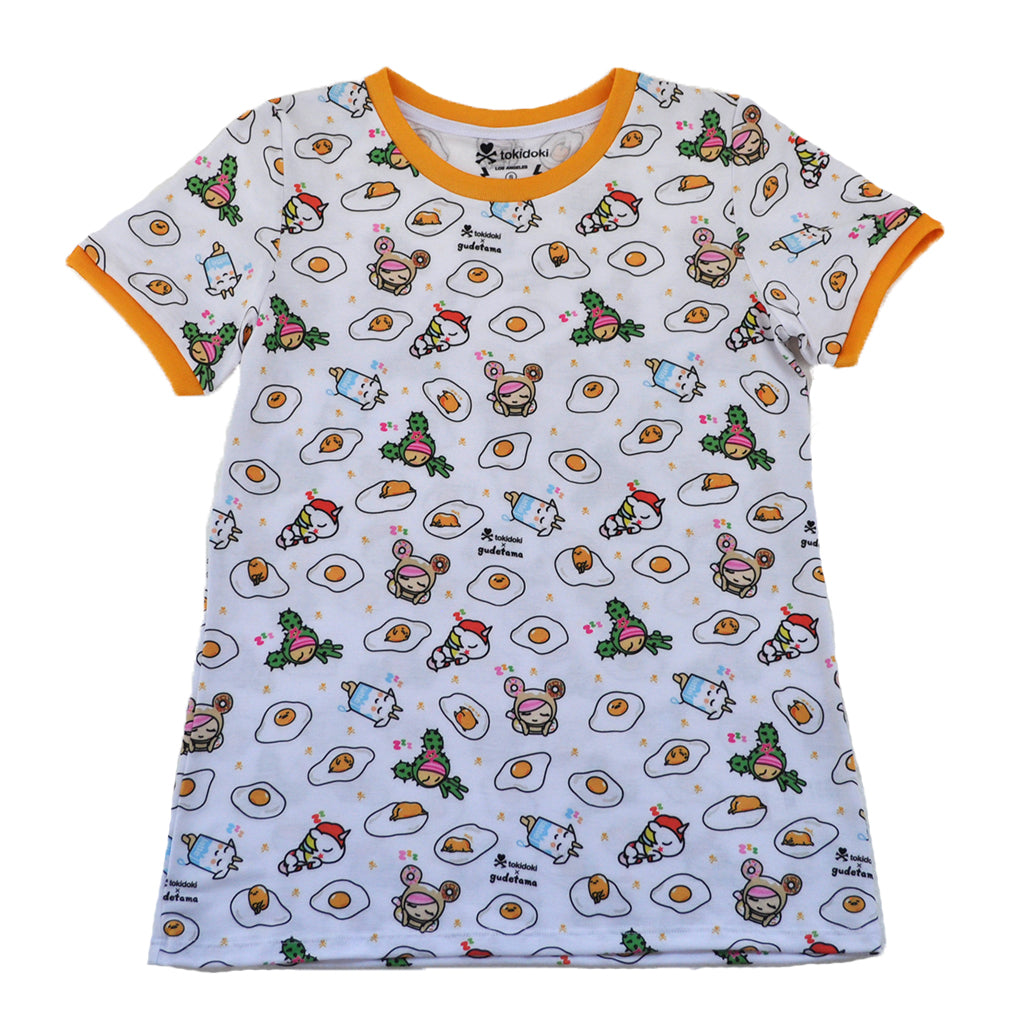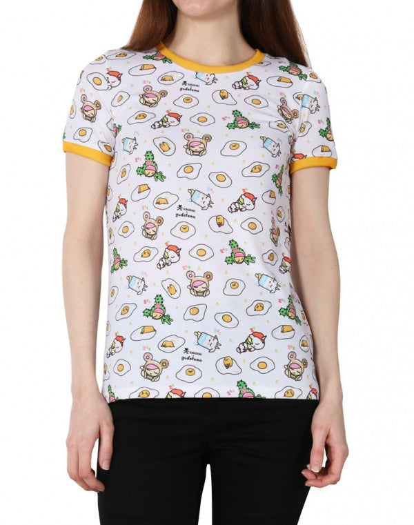 tokidoki teams up with the sleepiest egg for another super sweet collaboration. Women's ringer tee features Gudetama taking a nap with Donutella, Latte, SANDy, and Stellina on a custom all over print.