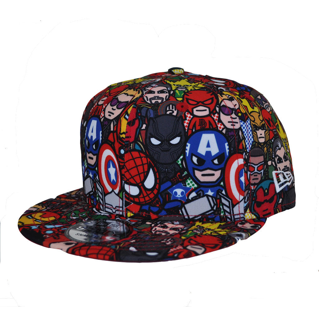 tokidoki x New Era 9FIFTY adjustable snapback features a sublimated Marvel heroes print. tokidoki skull and crossbones and the Marvel logo are embroidered on the back.