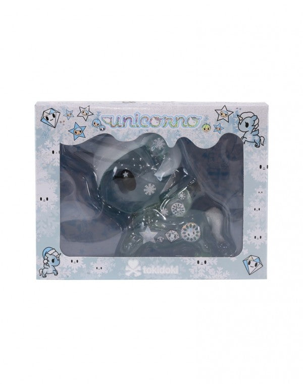 Ring in the holidays with this festive crystal clear blue Unicorno. Features fun holiday snowflakes, diamonds, and frosted sparkling accents. A dreamy and whimsical collectible!