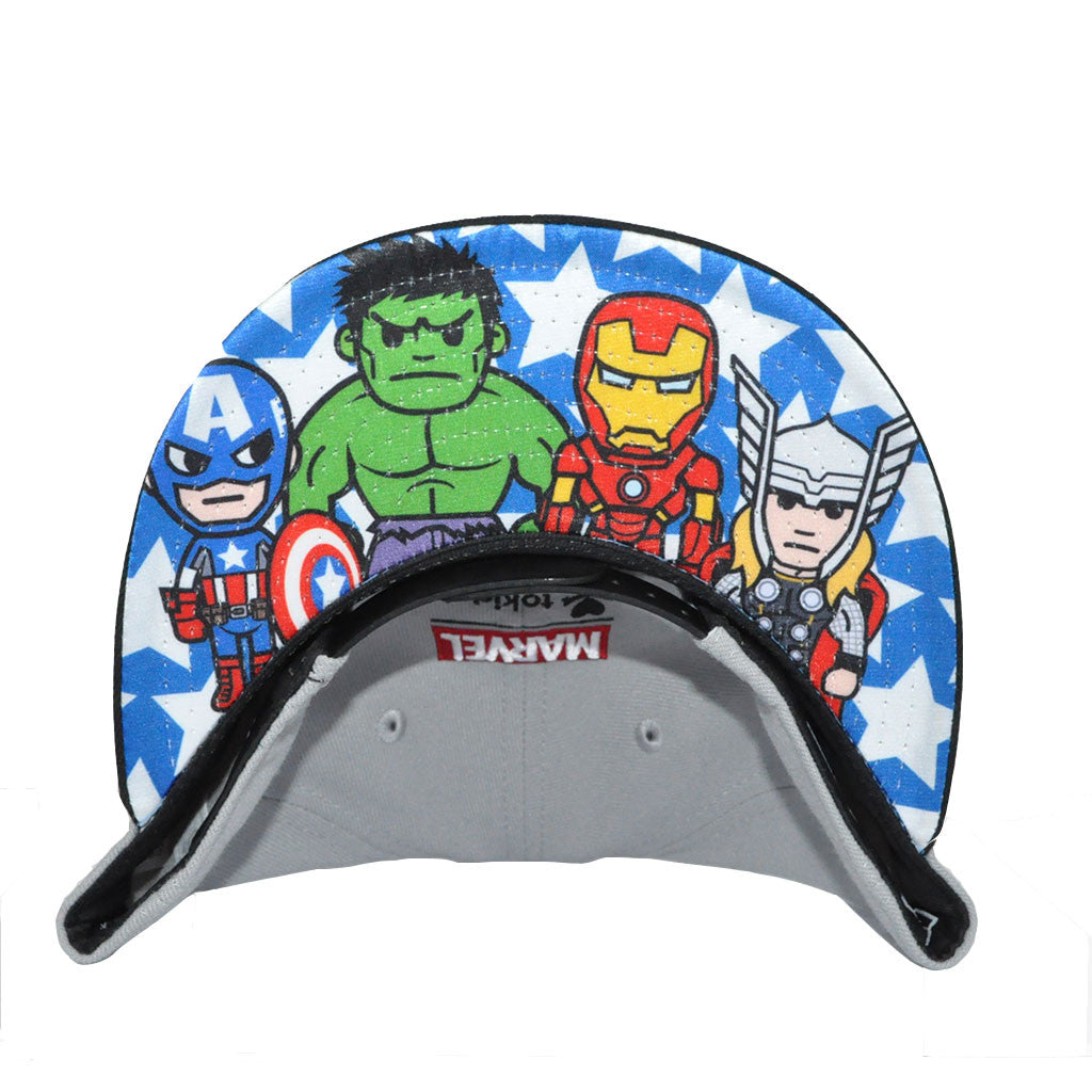 tokidoki x New Era 9FIFTY adjustable snapback features Captain America, Spiderman, Thor and Iron Man. Sublimated TKDK Marvel line up print on the underside of bill. tokidoki skull and crossbones and the Marvel logo are embroidered on the back.