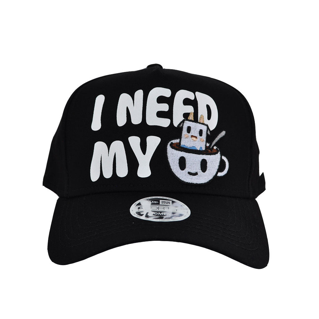 tokidoki x New Era 9FORTY adjustable snapback. Start your day with a hot cup of kawaii coffee! Features Latte floating in a cup of coffee . Sublimated Moofia print on the underside of bill. tokidoki skull and crossbones is embroidered on the back in white.