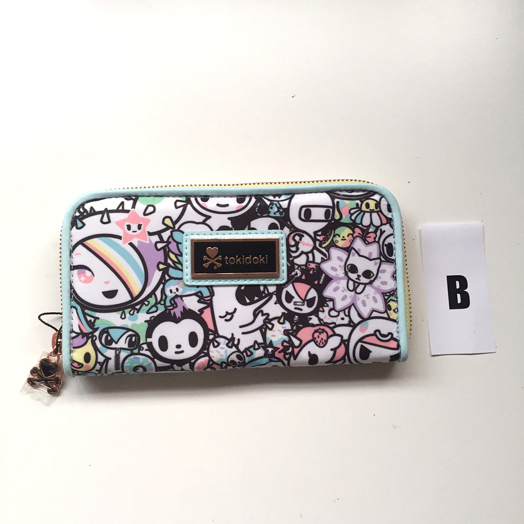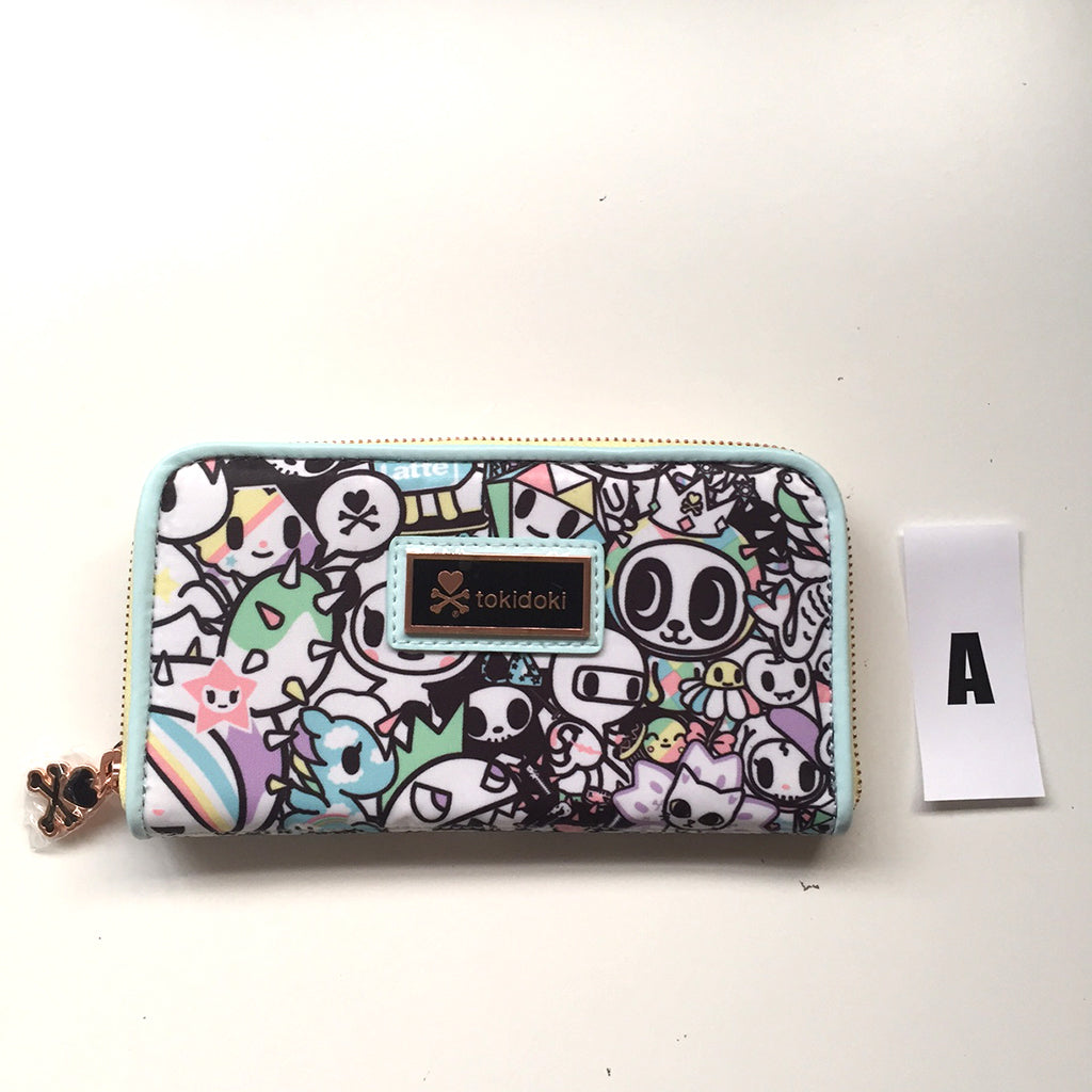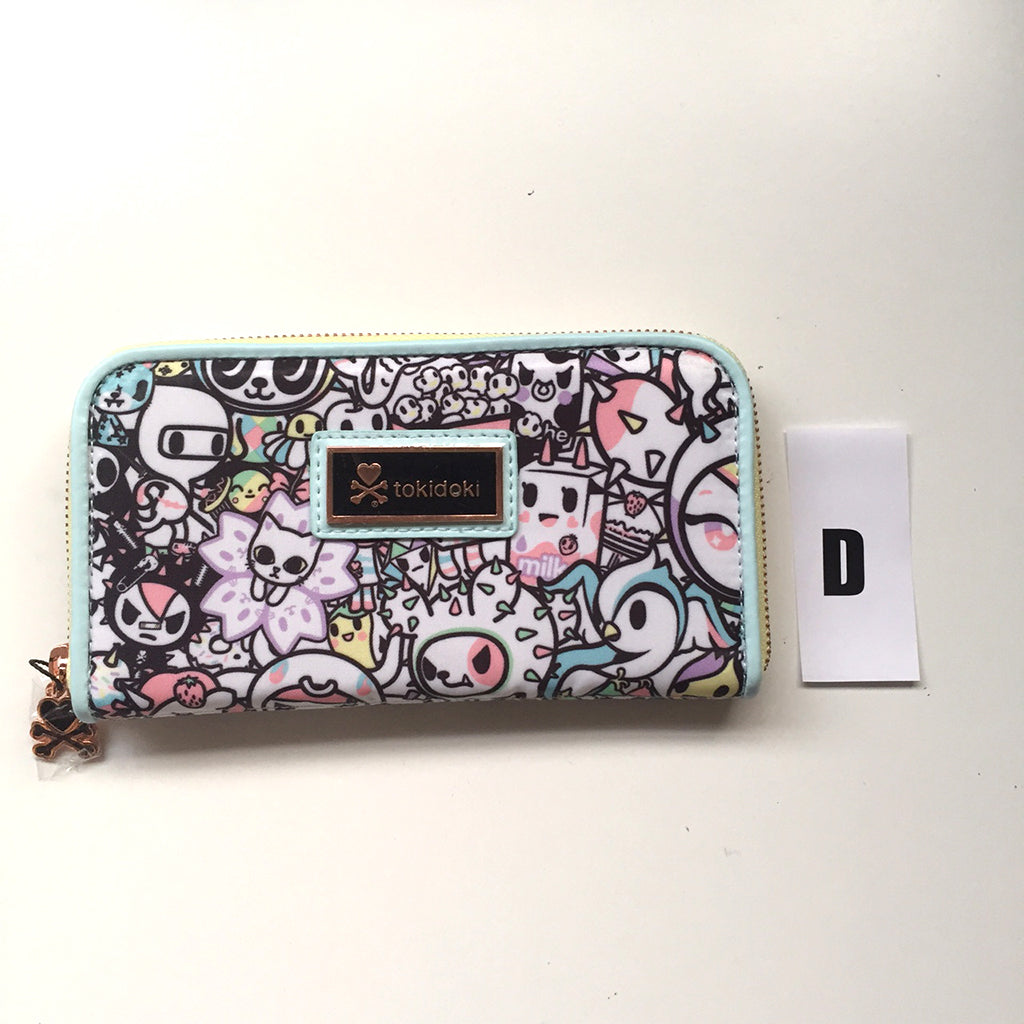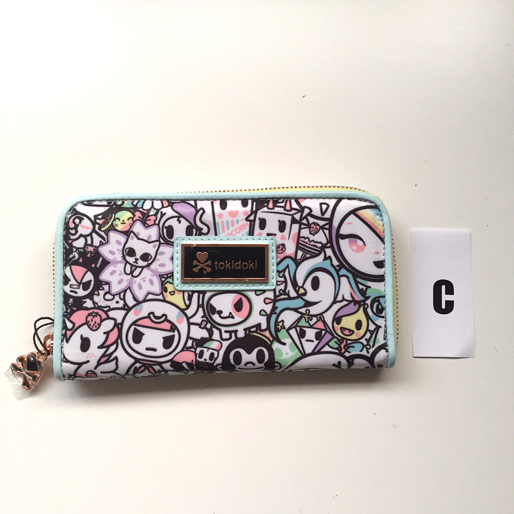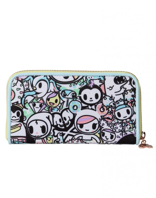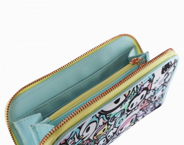 Large zip wallet with vegan leather interior & trim and space for 8 cards. Interior zip compartment for coins. tokidoki logos on zipper pulls.