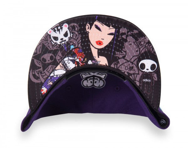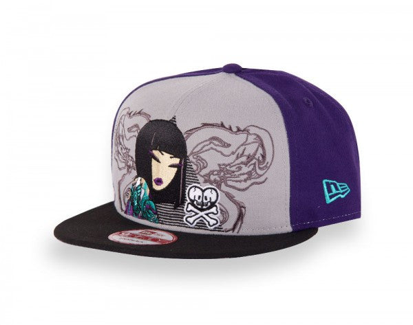 tokidoki x New Era 9FIFTY adjustable snapback features beautifully tattooed tokidoki girl surrounded by two dragons. Sublimated TKDK print on the underside of bill. tokidoki skull and crossbones is embroidered on the back.