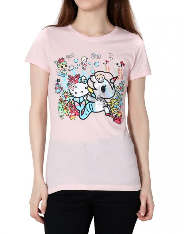 tokidoki teams up with Hello Kitty for another super sweet collaboration. Features Hello Kitty under the sea with her Mermicorno friends. Holographic detailing on graphic and holographic print tokidoki x Hello Kitty logo on the upper back.