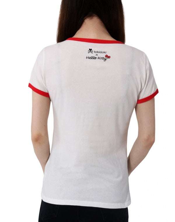 tokidoki teams up with Hello Kitty for another super sweet collaboration. Snap, kitty, pop! Women's ringer tee features Hello Kitty in a box full of fun and friends. tokidoki and Hello Kitty logos appear on the back of the neck.
