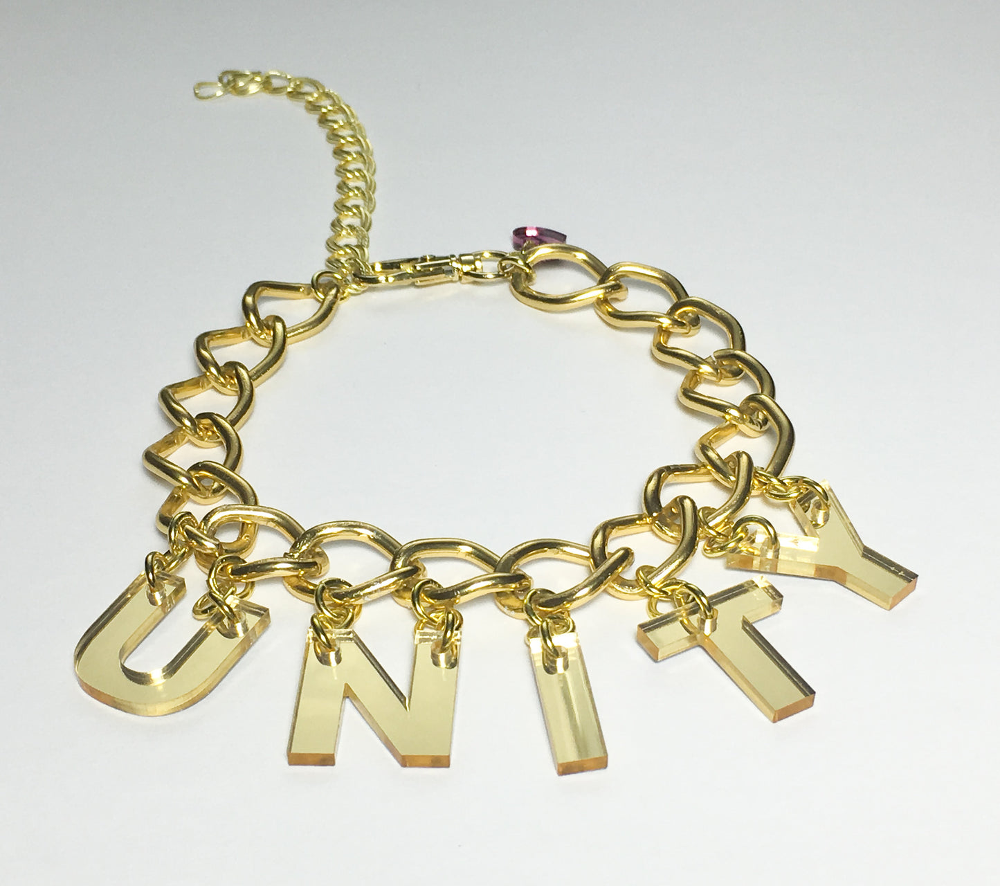 The Trixy Starr Unity choker features gold mirror acrylic letters on gold chain. This is a mAjor statement piece!! Neck is adjustable.