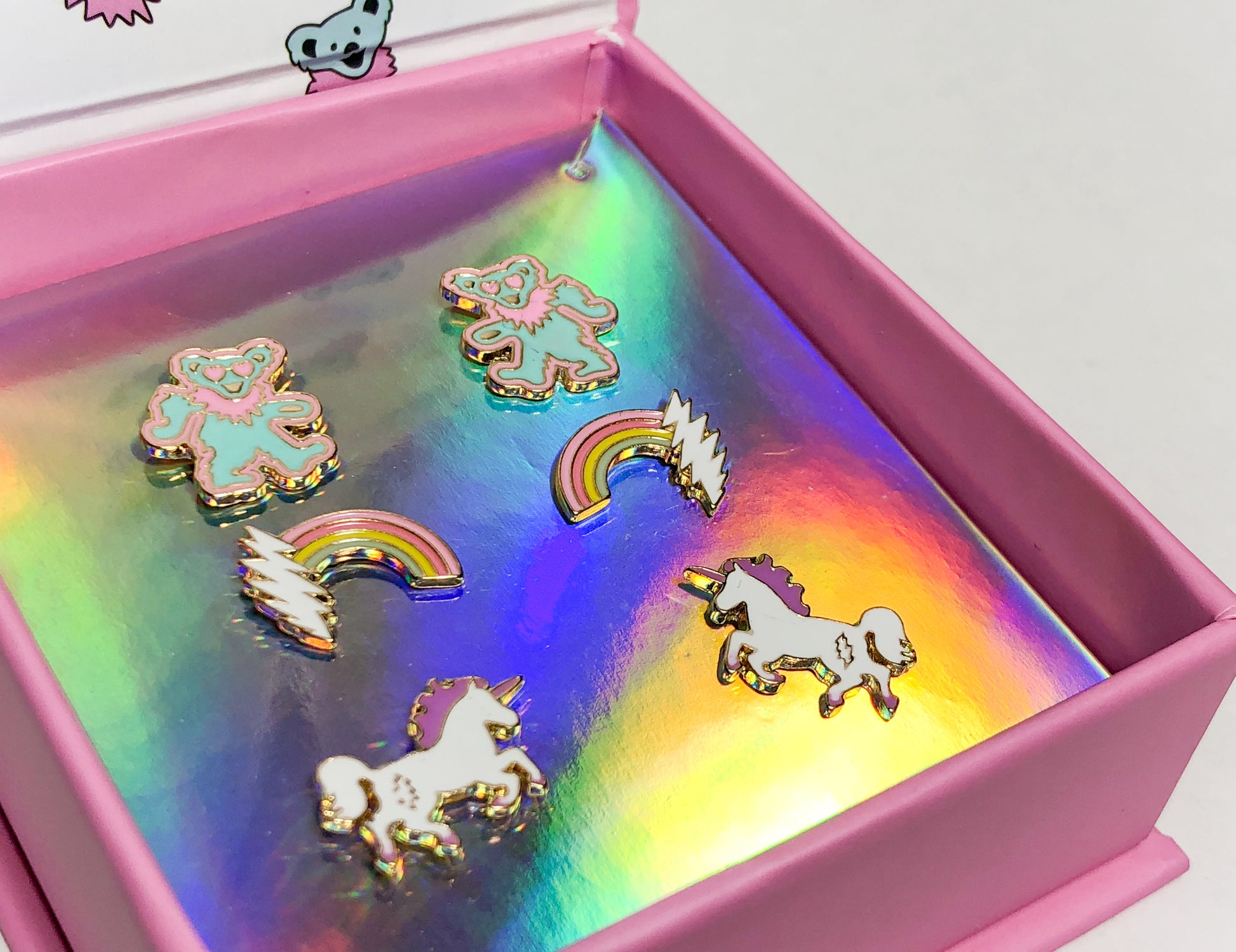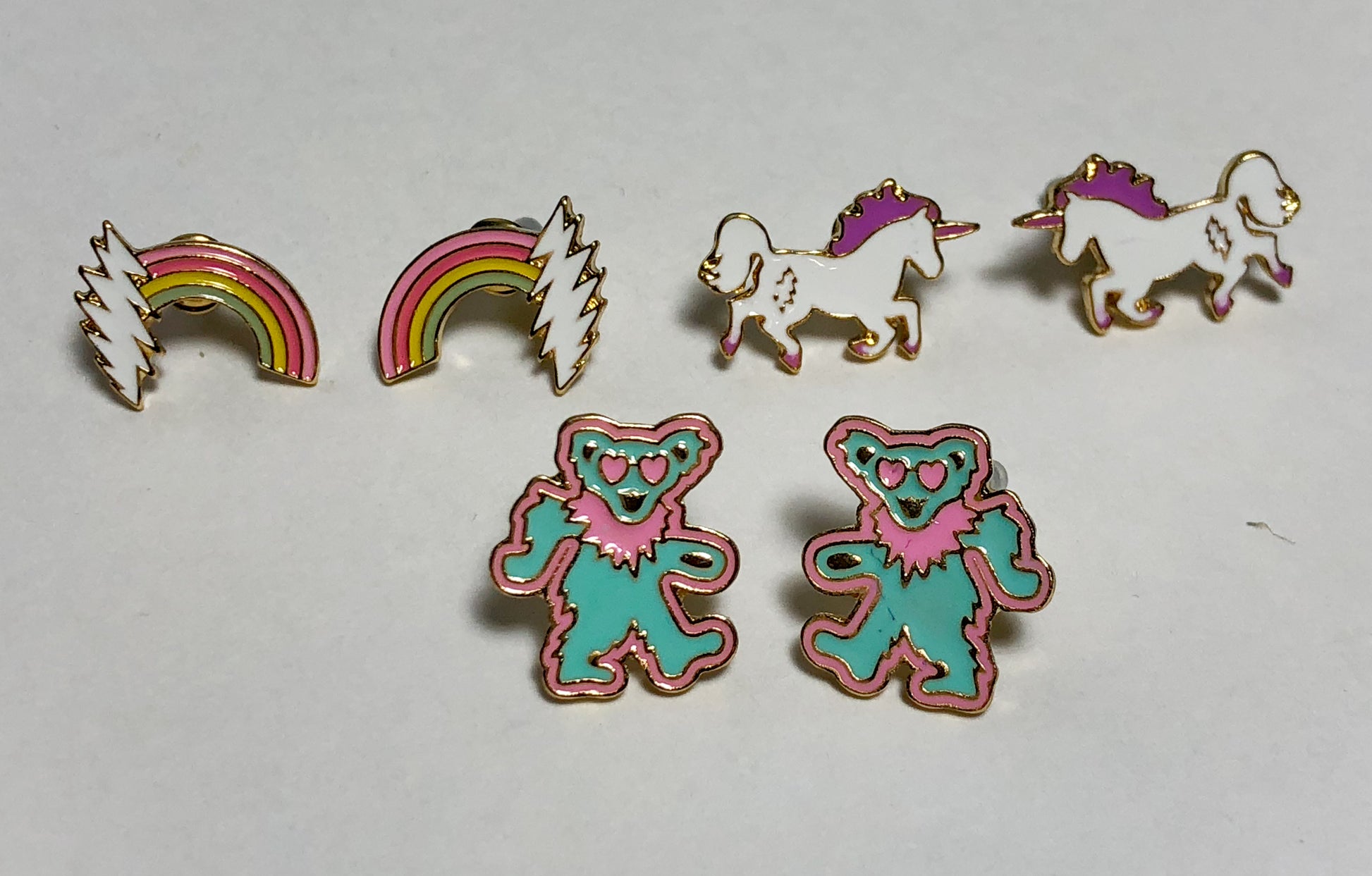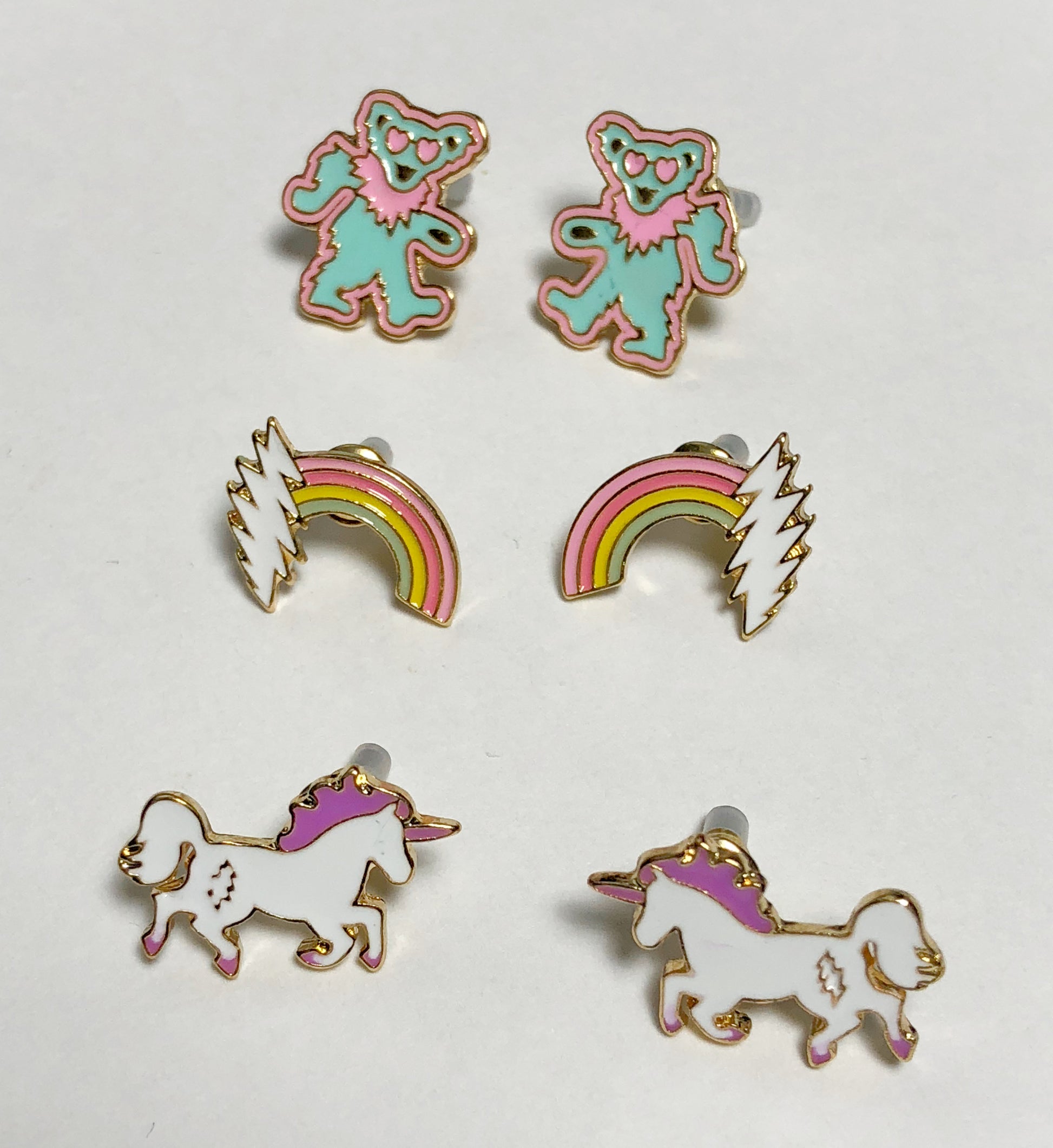 Limited edition set of Trixy Starr x Grateful Dead stud earrings includes 3 pairs of stud earrings: rainbow with lightning bolt, unicorn with bolt, and dancing bear with heart shades. A mix of base metal, enamel and brass