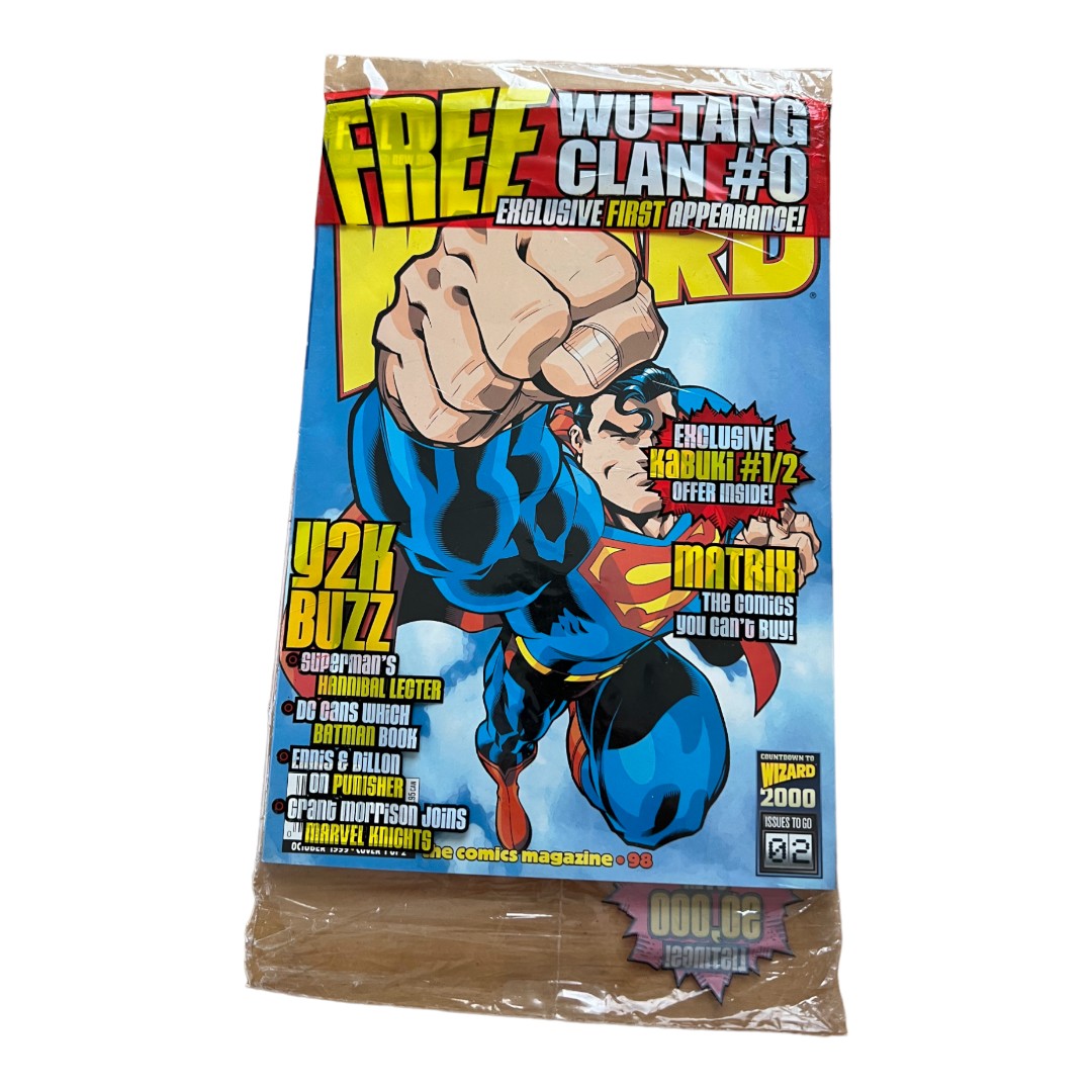 Wizard Comic Magazine Issue #98 Oct 1999 New & Sealed - WU TANG CLAN #0 - SUPERMAN Cover. The bottom of the plastic bag has split apart over time.